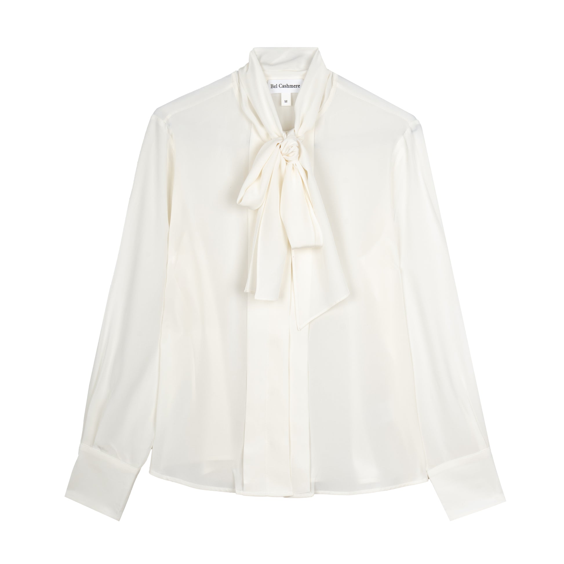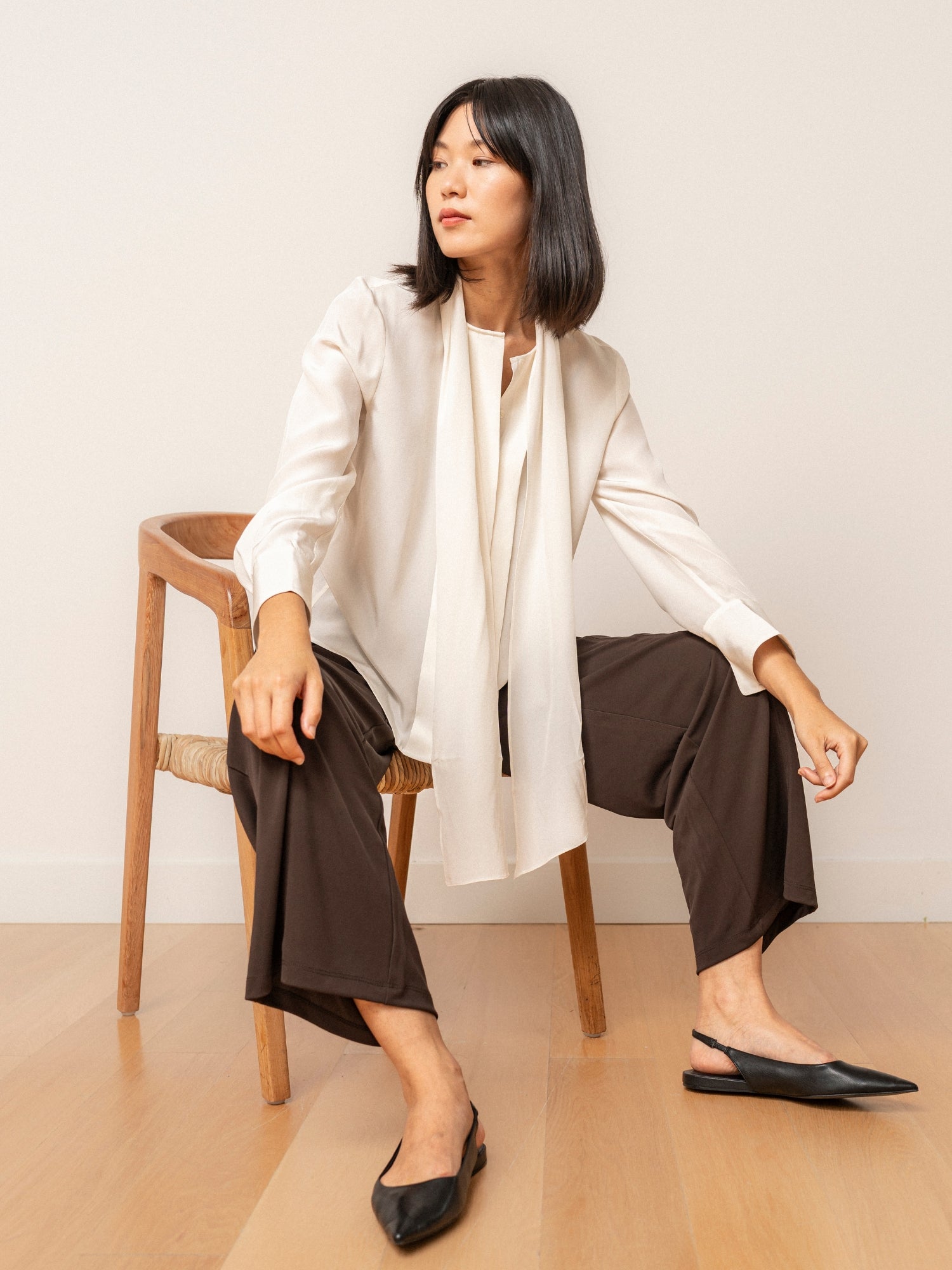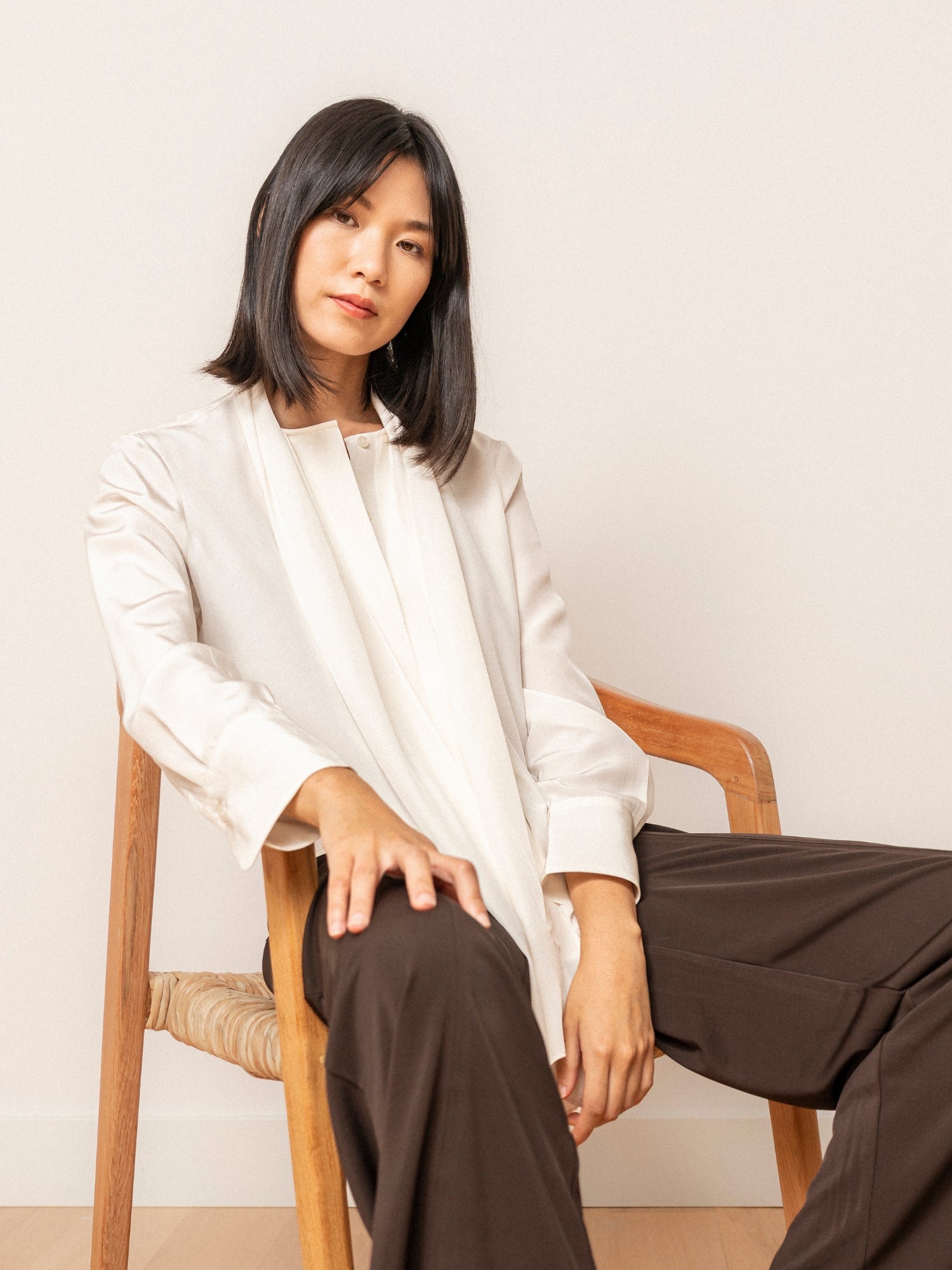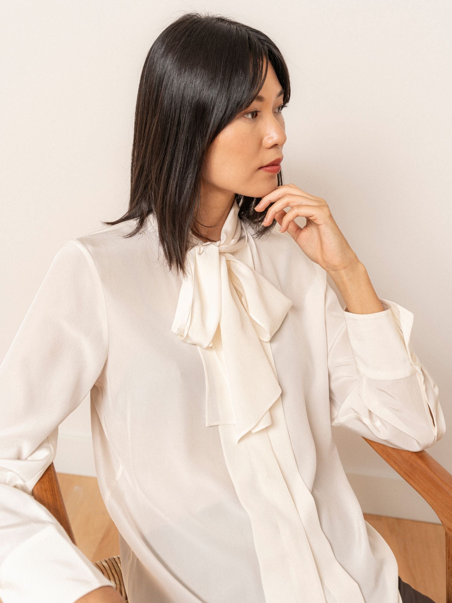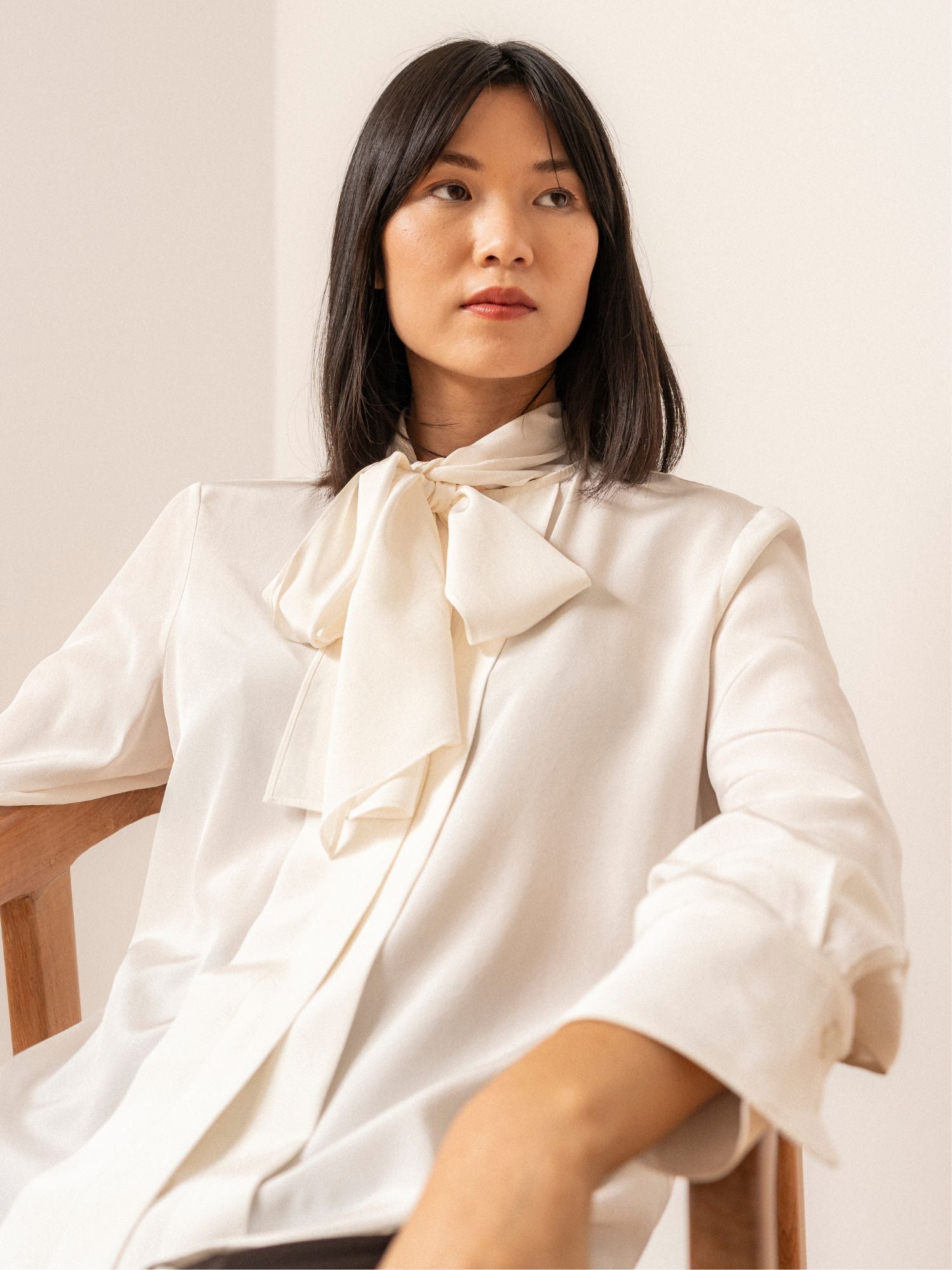 Eine Ode an kultivierte Weiblichkeit. Die Carmen-Bluse aus reinem Seiden-Crêpe de Chine umhüllt die Silhouette mit einem fließenden, ätherischen Fall. Die zarte Schleife am Hals verleiht einen romantischen und zeitlosen Touch, der jeden Look aufwertet, egal ob Tag oder Nacht. Ideal für Frauen, die mühelose Eleganz, subtilen Luxus und ein wirklich schmeichelhaftes Stück suchen.