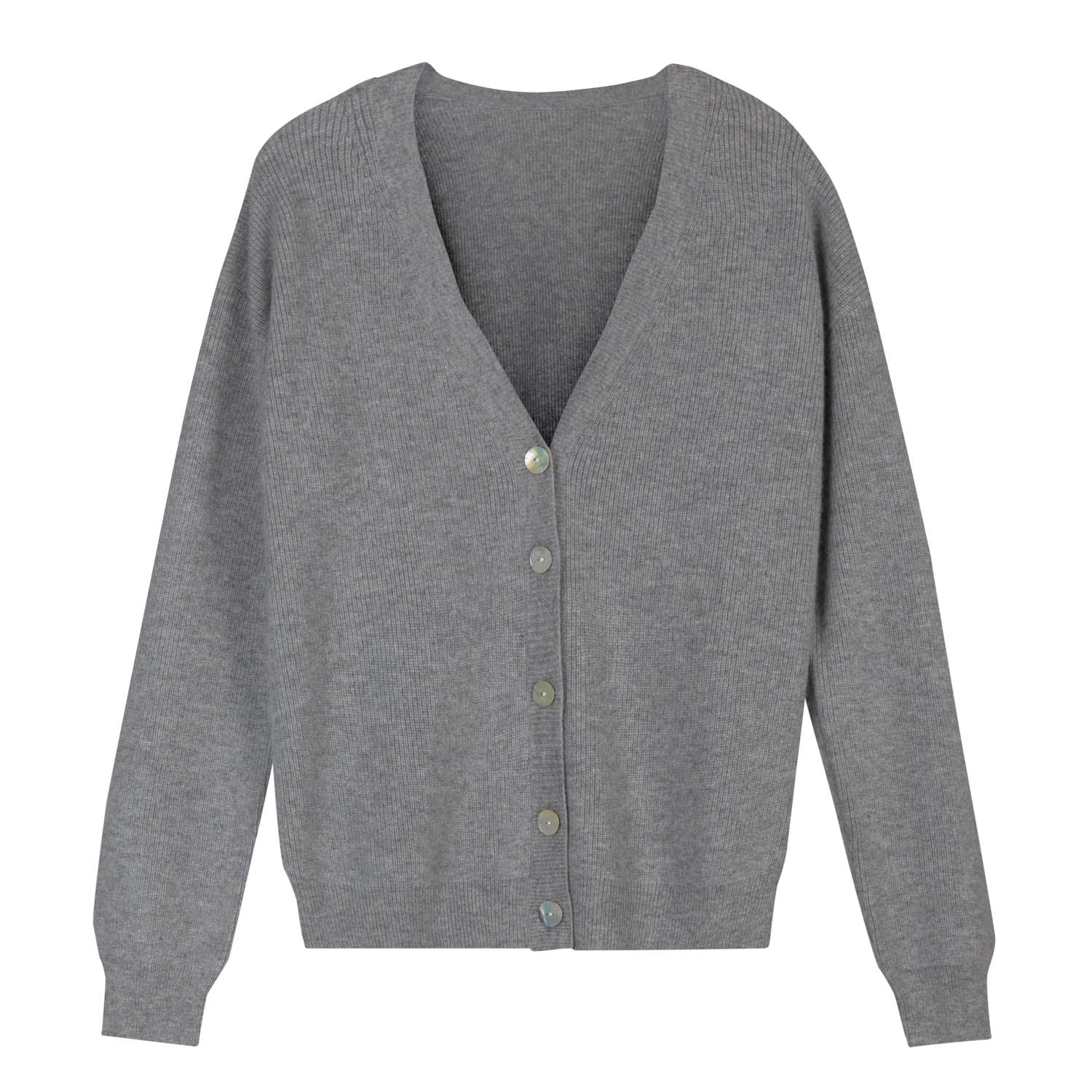 Eine einfache Strickjacke aus 100 % mongolischem Kaschmir in einem schönen, neutralen und schmeichelhaften Grau.