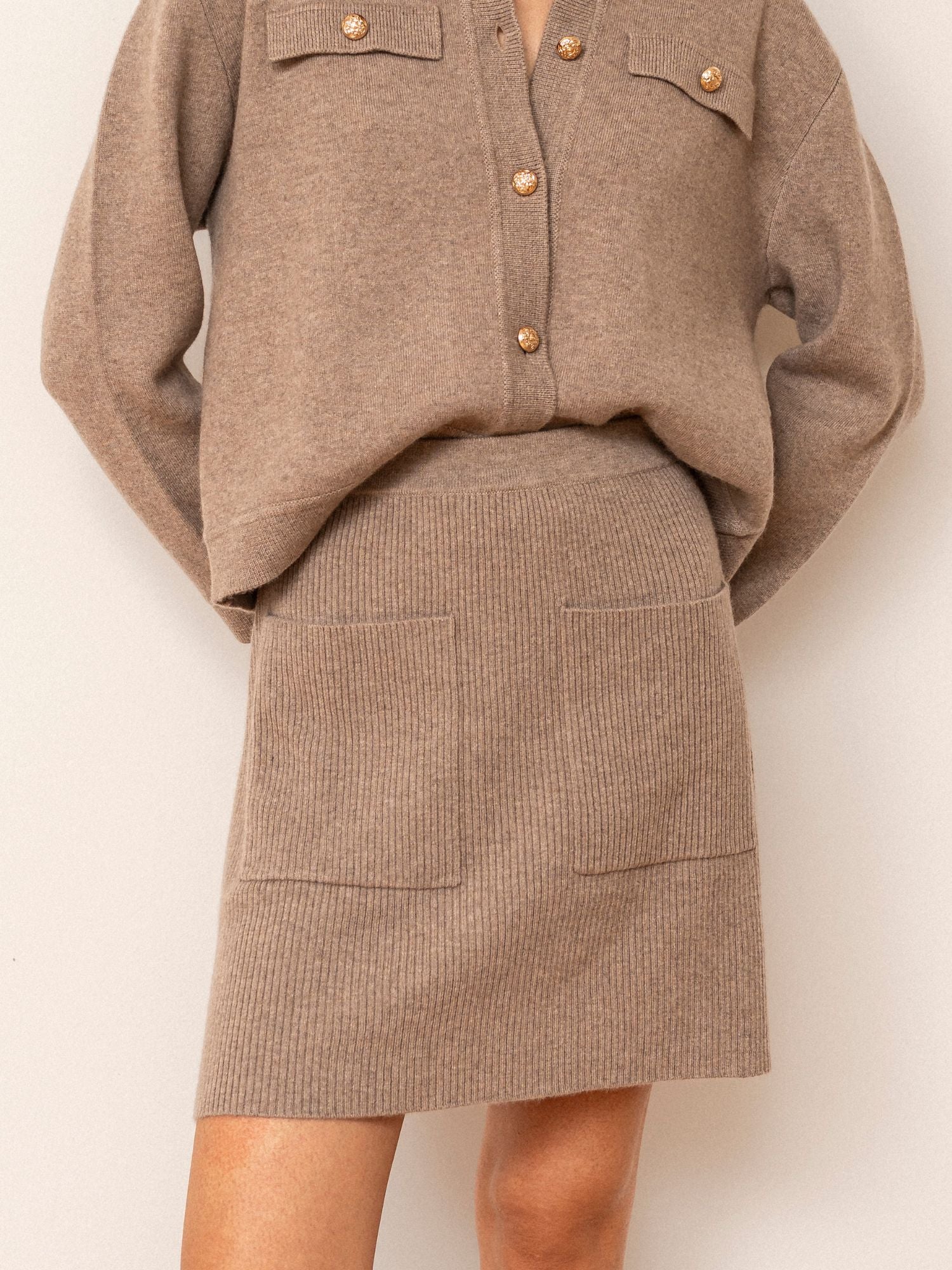 Der Sylvie-Rock besteht aus einem Mischgewebe aus 30 % Kaschmir und 70 % Wolle und fühlt sich dadurch weich und warm an. Er ist gerade geschnitten, hat einen feinen Rippenbesatz und zwei Fronttaschen für einen modernen und funktionalen Touch. Ein vielseitiges und feminines Kleidungsstück, perfekt kombinierbar mit der passenden Jacke oder lässigeren Kleidungsstücken.