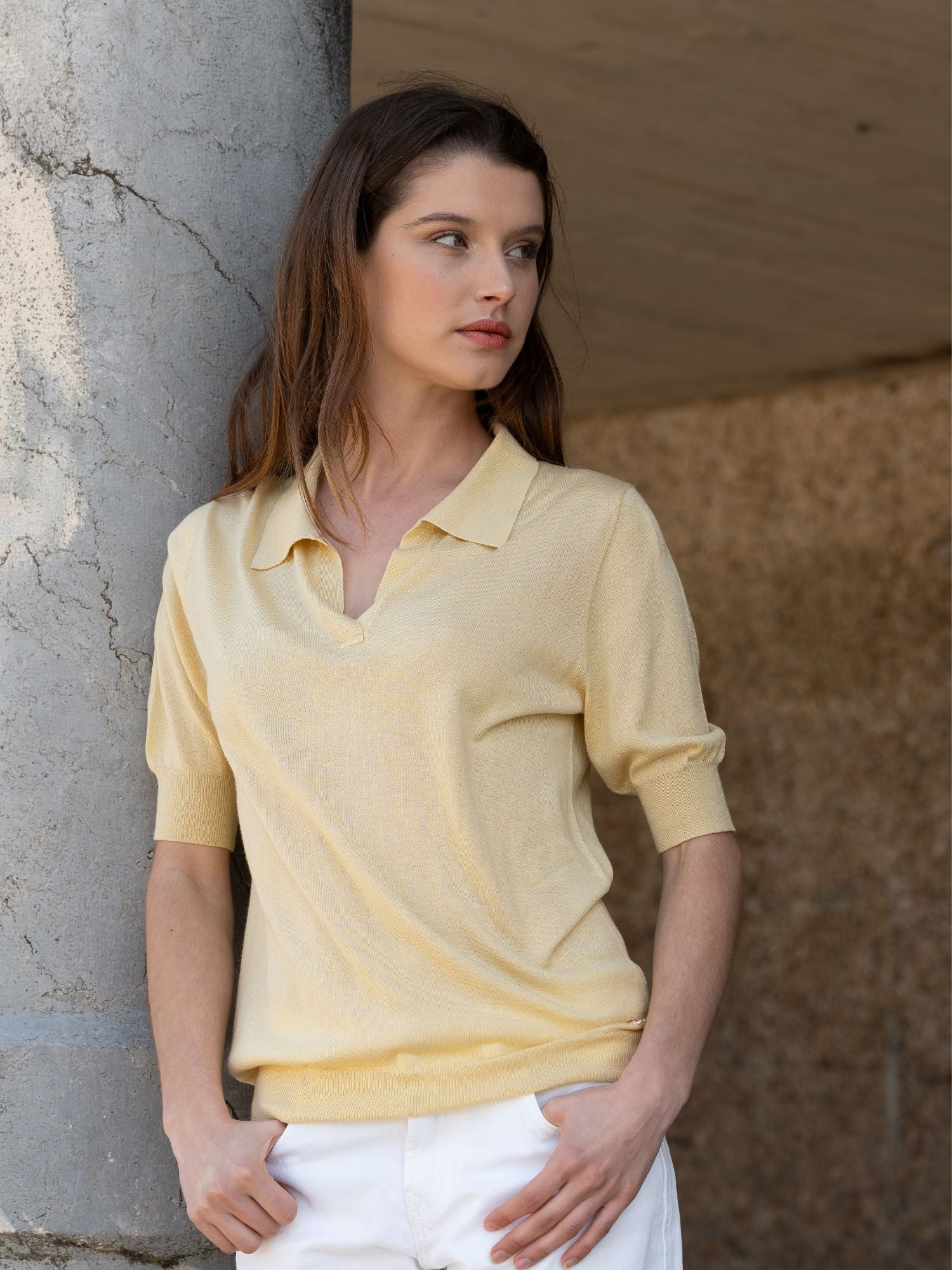 Dieses Poloshirt aus fein gestrickter Seide und Kaschmir wird zu einem der vielseitigsten und schmeichelhaftesten Kleidungsstücke in Ihrer Garderobe.