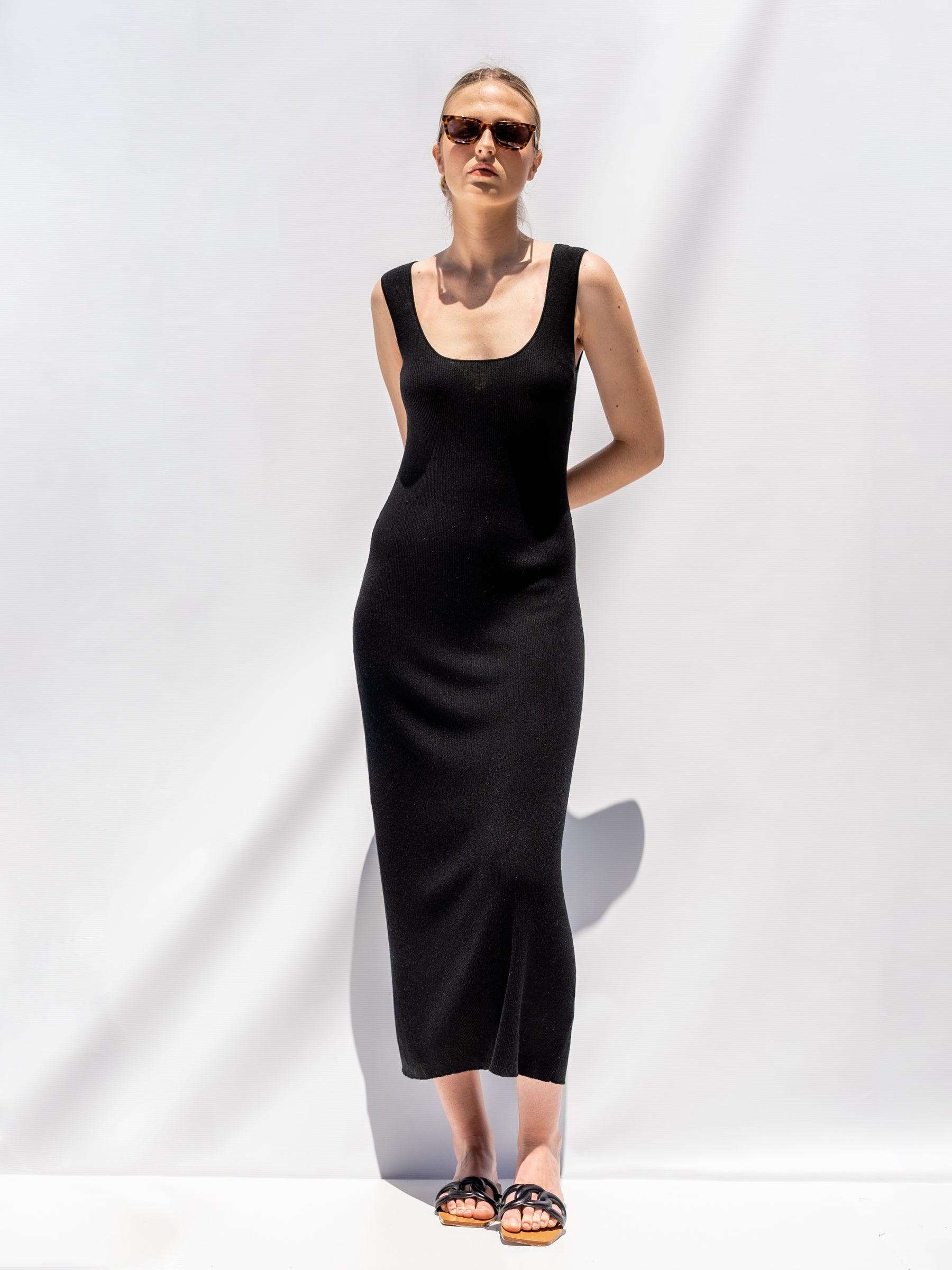Schönes langes schwarzes Strickkleid.