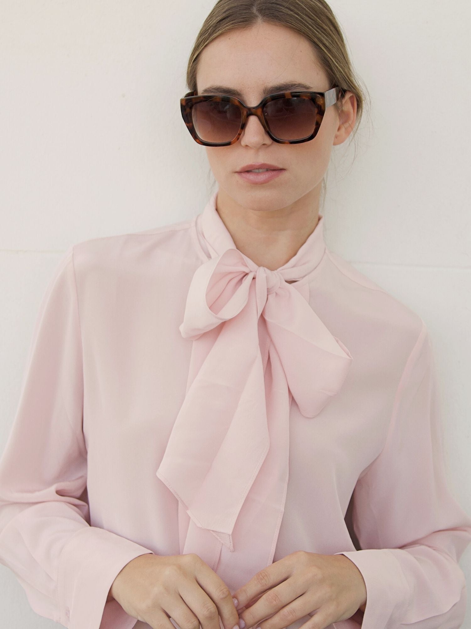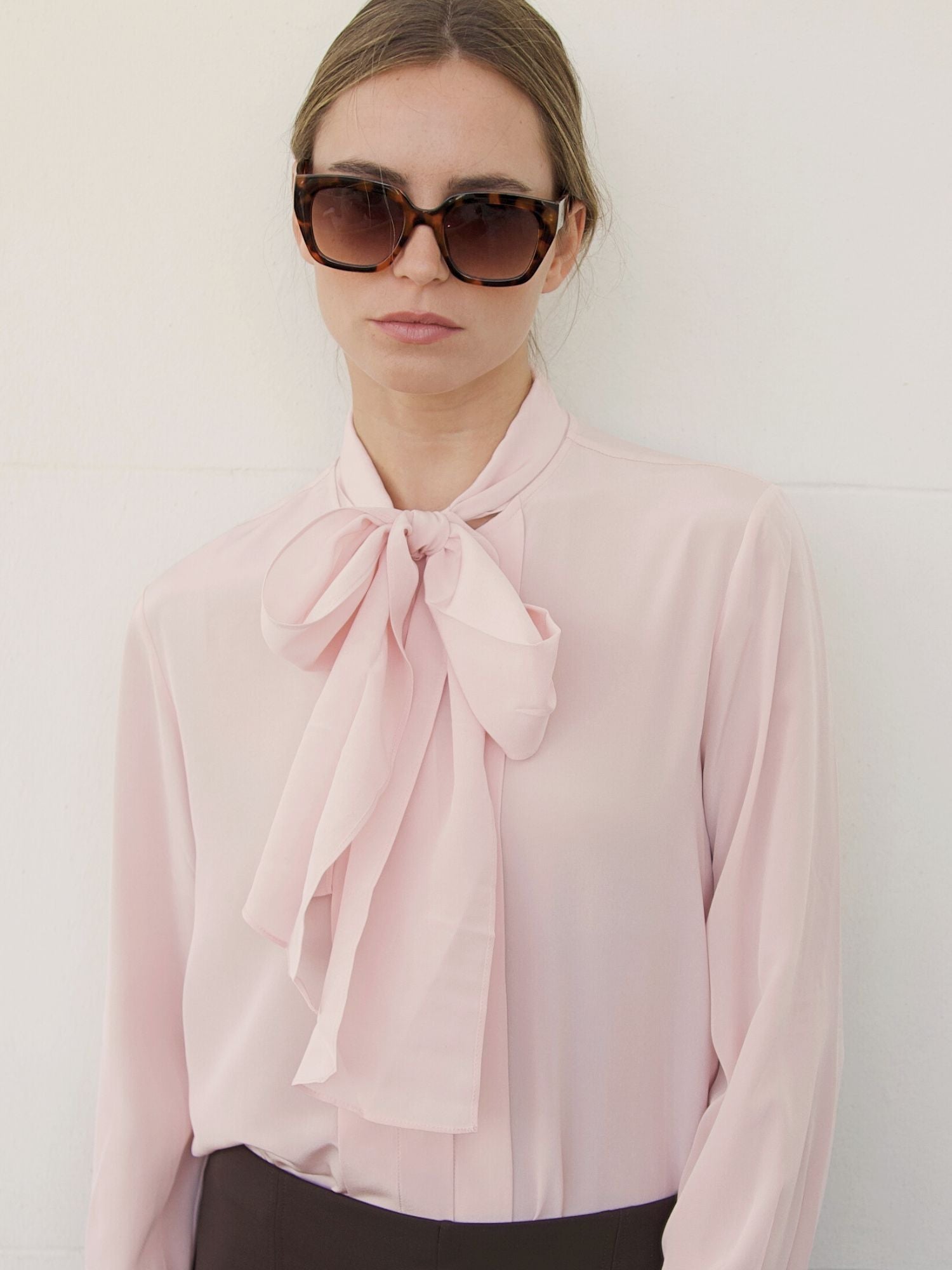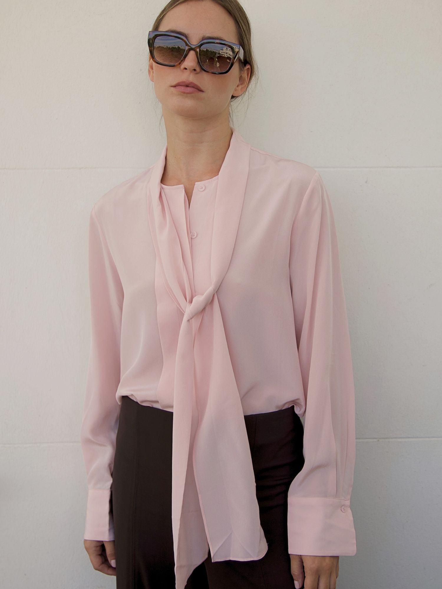 An ode to sophisticated femininity. The Carmen blouse, crafted from pure silk crepe de chine, envelops the silhouette with a fluid, ethereal drape. Its delicate bow at the neck adds a romantic and timeless touch that elevates any look, whether day or night. Ideal for women seeking effortless elegance, subtle luxury, and a truly flattering piece.