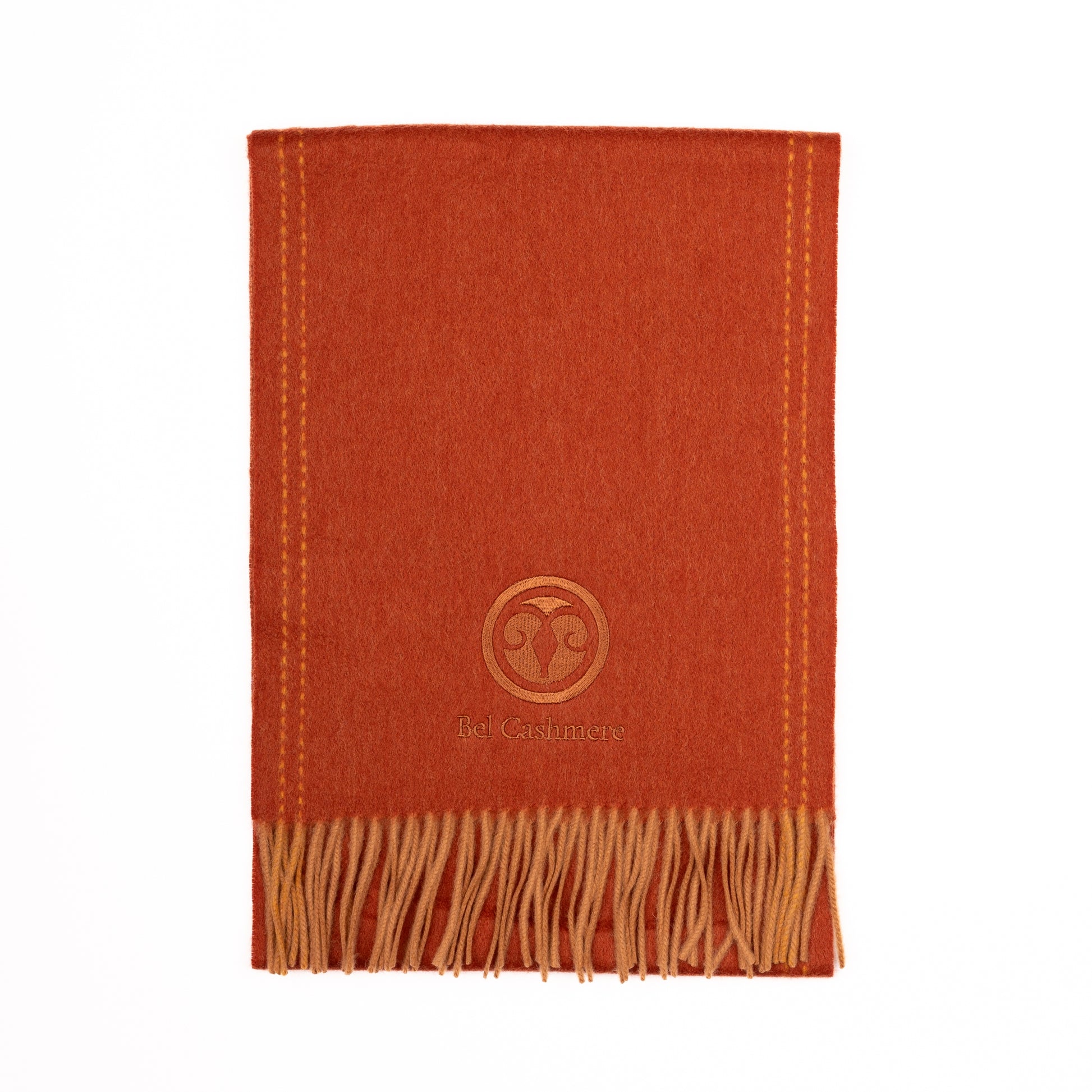 A classic and timeless scarf woven from the finest pure cashmere. Woven double-sided in two shades of rust and brown.