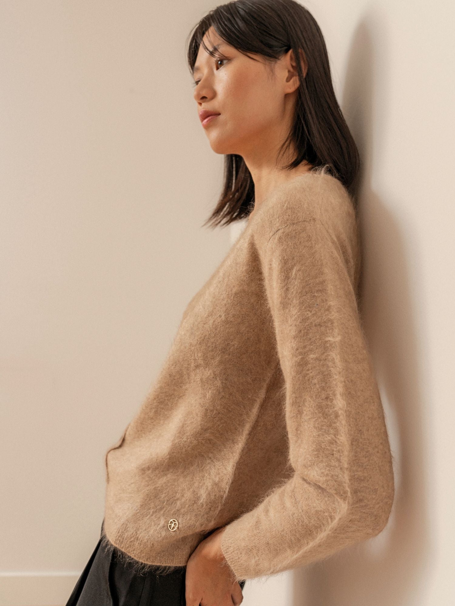The Amy jacket in brushed cashmere is defined by its clean V-neckline and balanced cut. A pared-back design that exudes effortless sophistication.