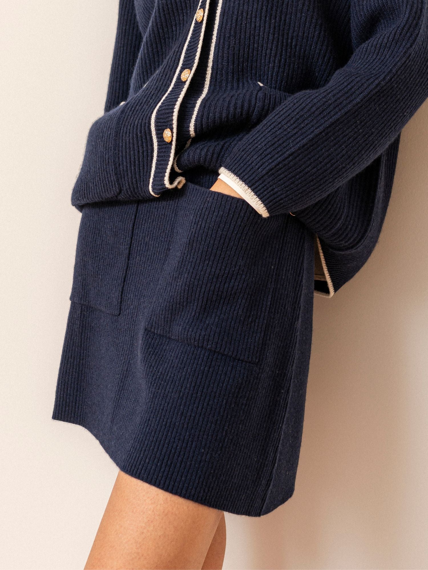 The Sylvie skirt is made from a 30% cashmere and 70% wool blend, giving it a soft, warm feel with a lightweight finish. Featuring a straight cut and fine ribbed trim, it's complete with two front pockets for a modern and functional touch. A versatile and feminine piece, perfect for pairing with the matching jacket or more casual pieces.