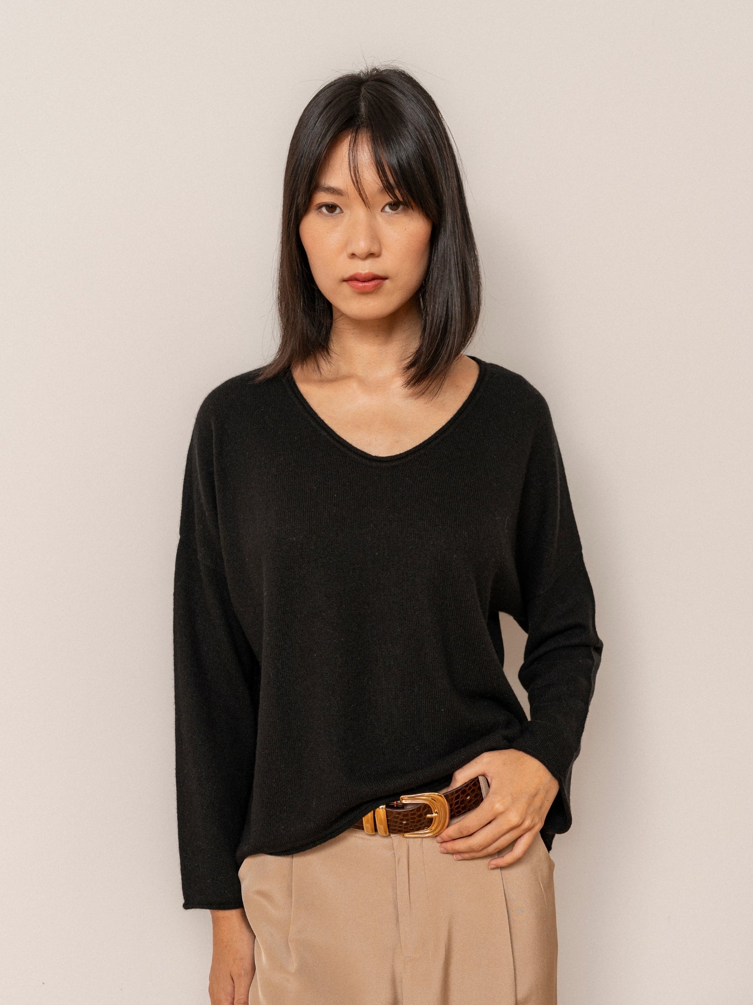 The Anaïs sweater is made from pure, fine-gauge (12gg) cashmere, giving it a soft, caressing texture without sacrificing warmth.