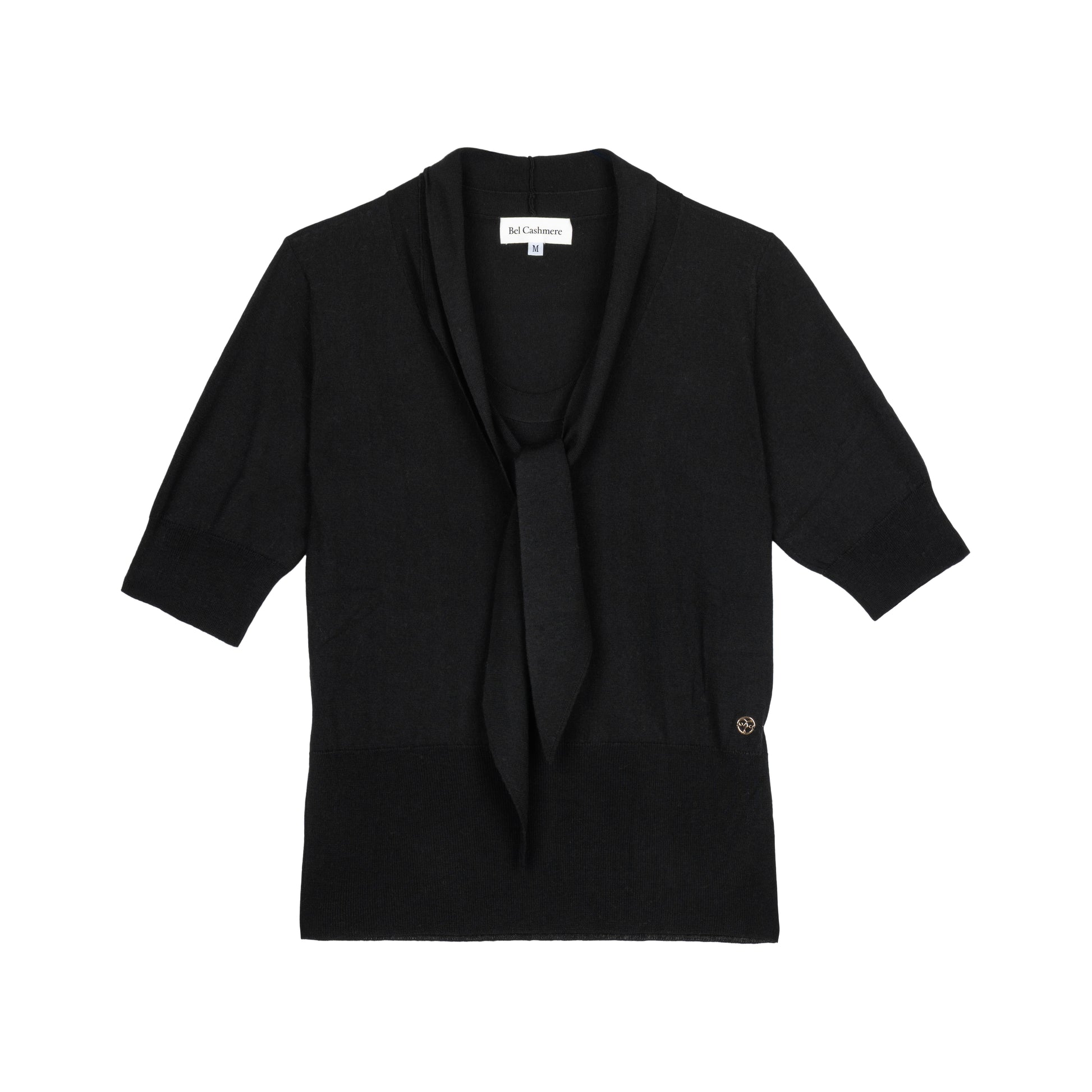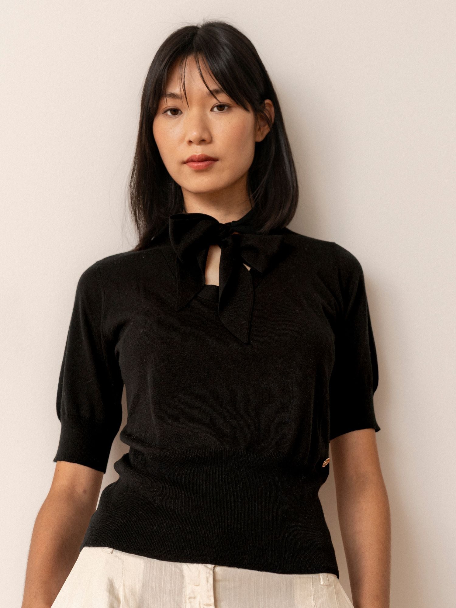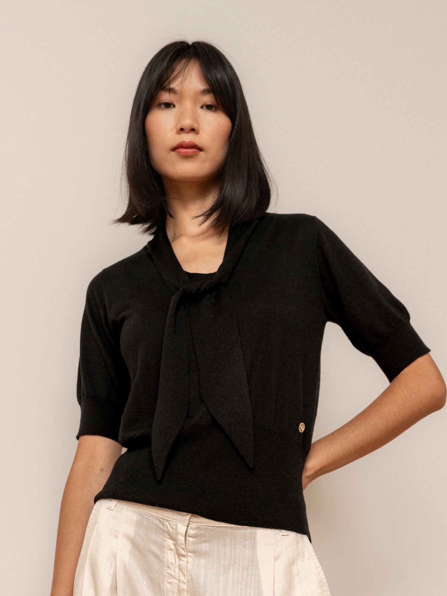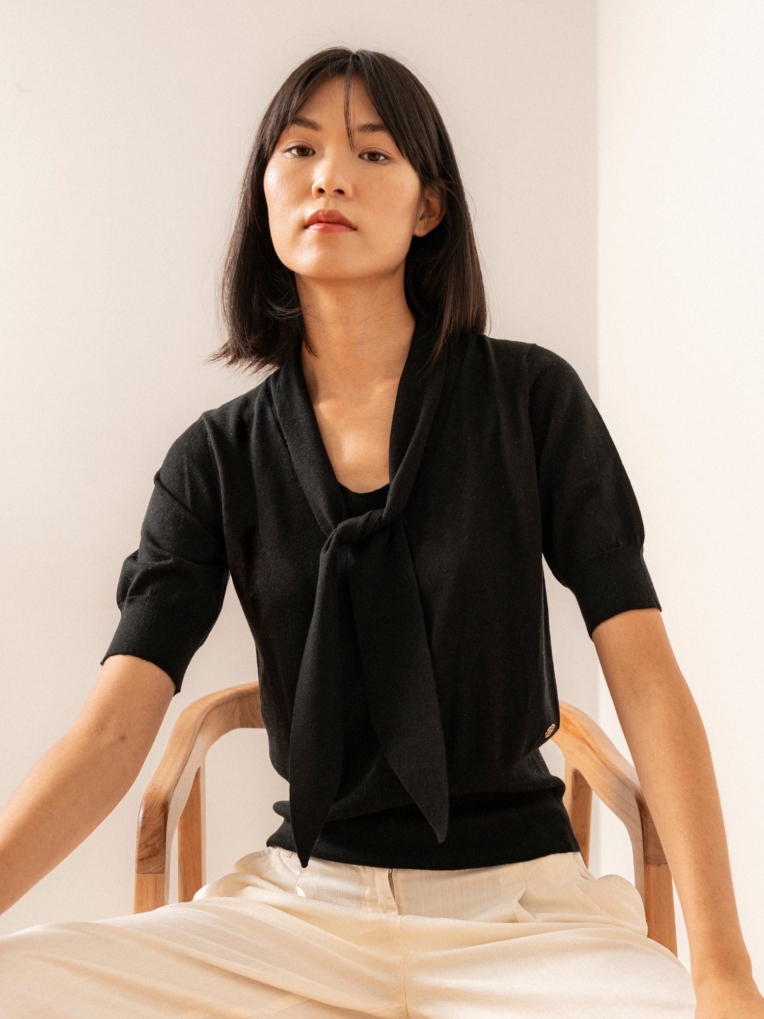 The Kelly sweater is a fine silk and cashmere knit. Its short-sleeved design and lightweight silhouette make it an ideal piece for transitional seasons or year-round style. The bow detail at the neck adds a romantic and refined touch that elevates any look, from the most casual to the most elegant.