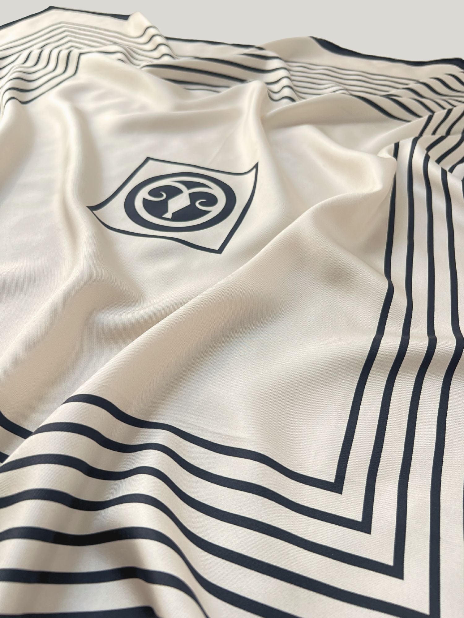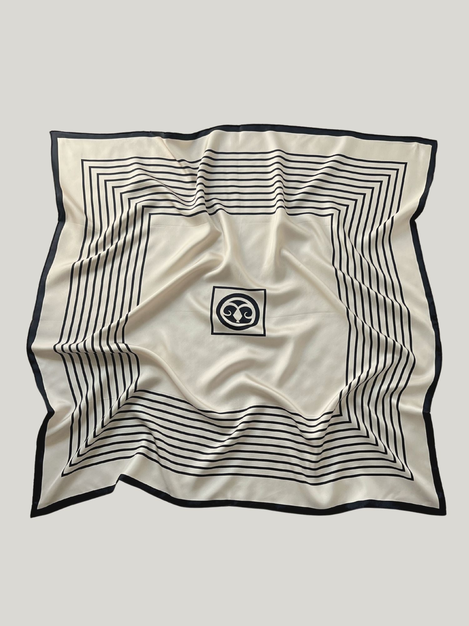 This scarf is made of pure silk. It features a beautiful and timeless striped design, and its generous 90 x 90 cm size allows it to be worn in a variety of ways.