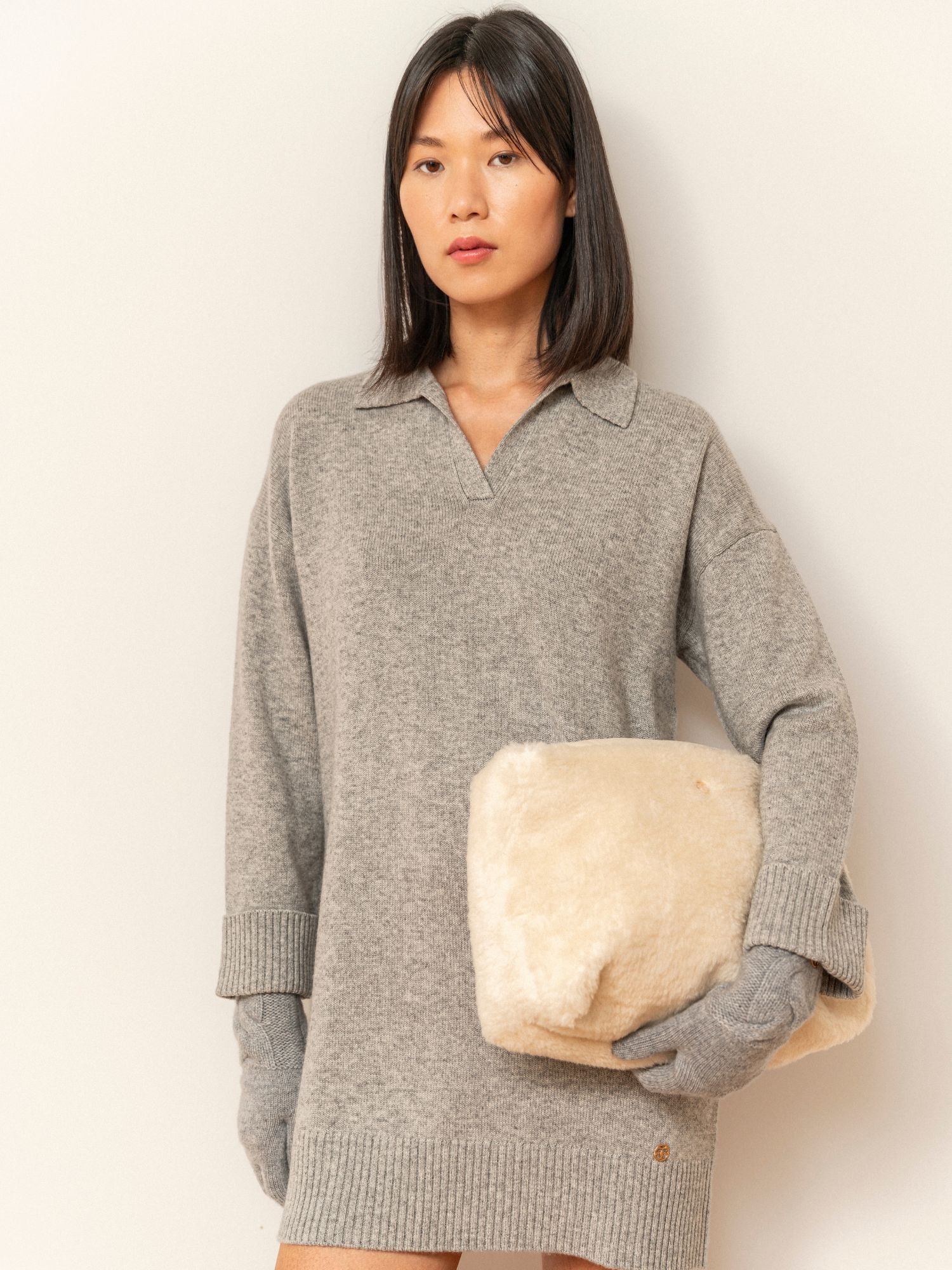The Lea dress, with a cashmere and wool polo neck, combines a sporty look with relaxed elegance. Its enveloping fabric effortlessly follows your every move.