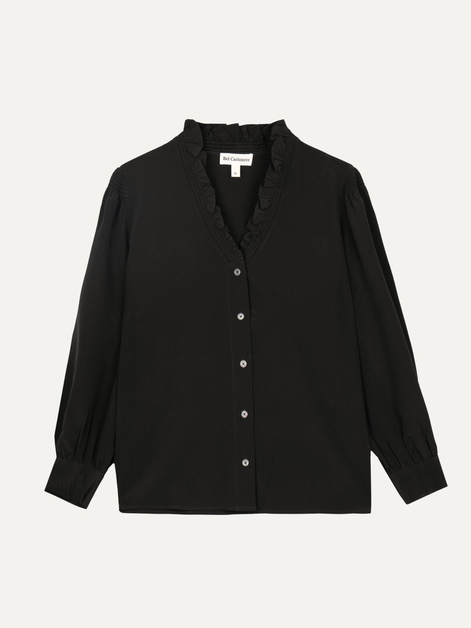 En un profundo tono negro, esta pieza se convierte en un esencial versátil: tan perfecta para elevar un look de día como para acompañar ocasiones nocturnas con un aire de discreta elegancia. Una prenda que encarna la esencia de la feminidad contemporánea: ligera, exquisita y eterna.