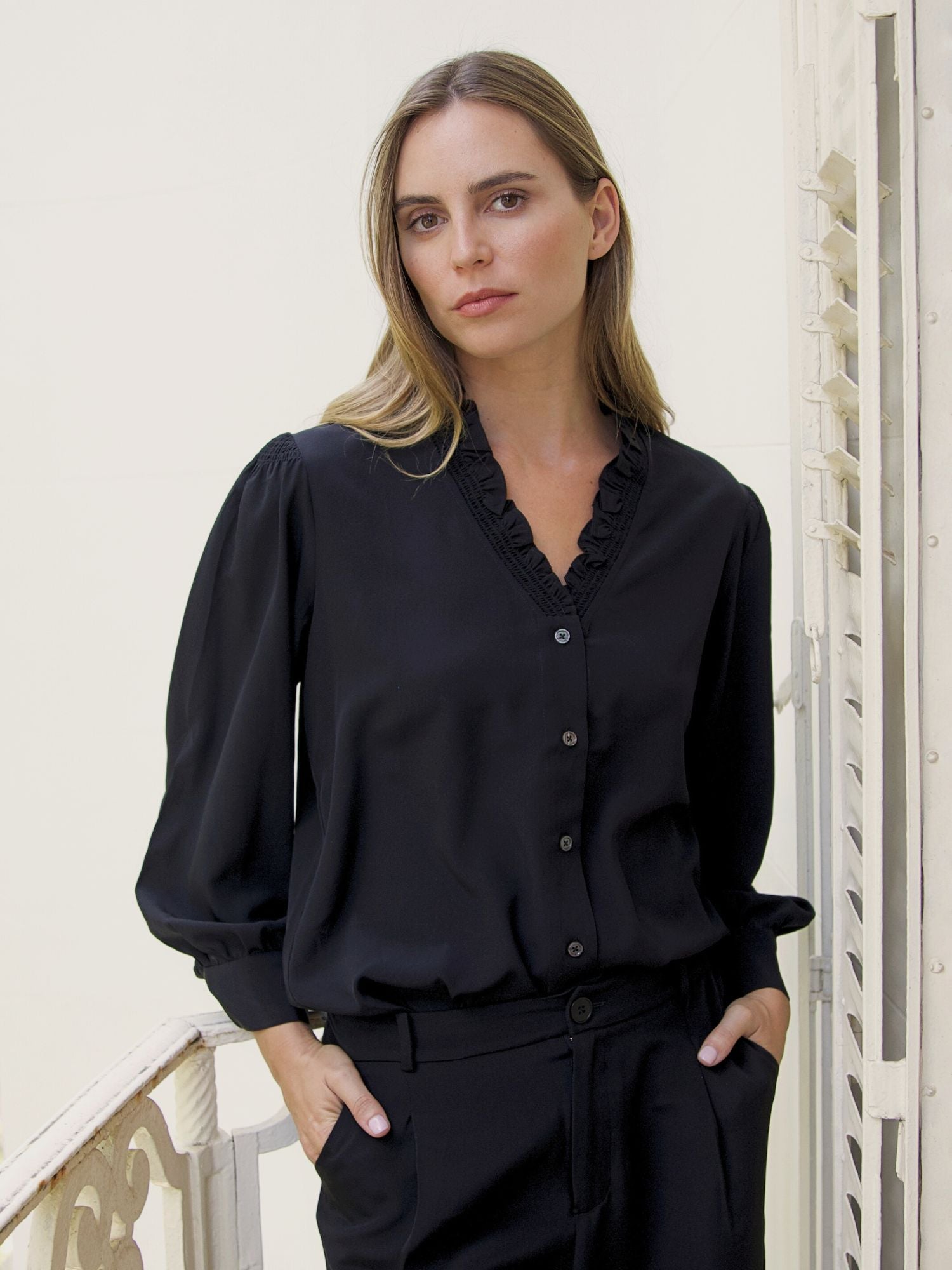 Un icono de sofisticación atemporal. La blusa Lauren está confeccionada en pura seda crêpe de chine, reconocida por su caída fluida y su sutil luminosidad. Su diseño destaca por un delicado volante en el cuello que enmarca un escote en V, aportando feminidad y refinamiento a cada movimiento.