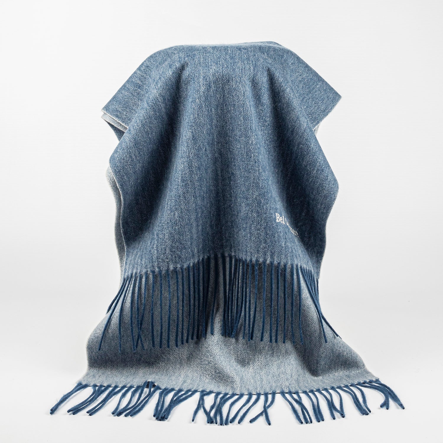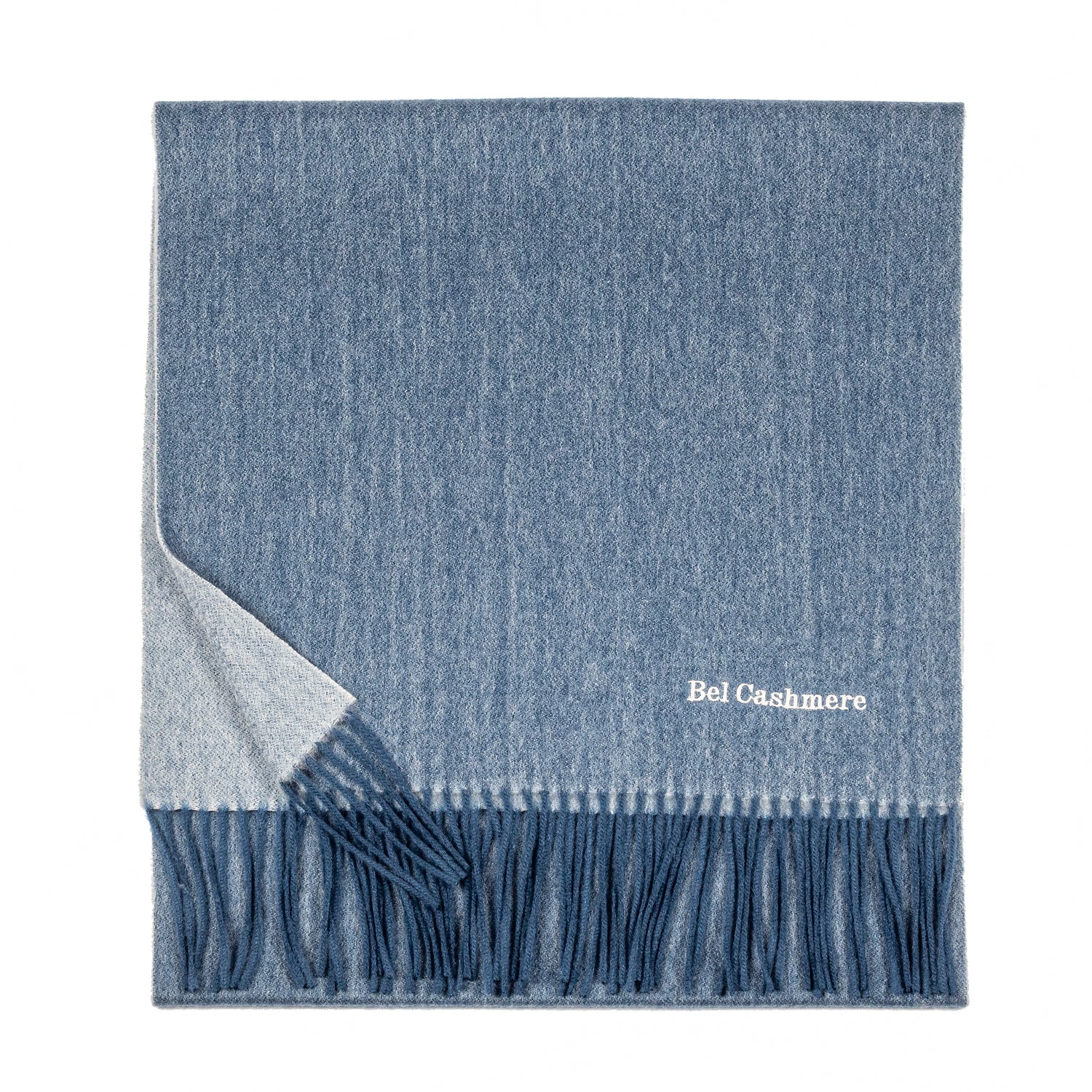 Una bufanda clásica y atemporal tejida con puro cashmere de la mejor calidad. Tejida con doble faz en dos tonalidades azul y crema.