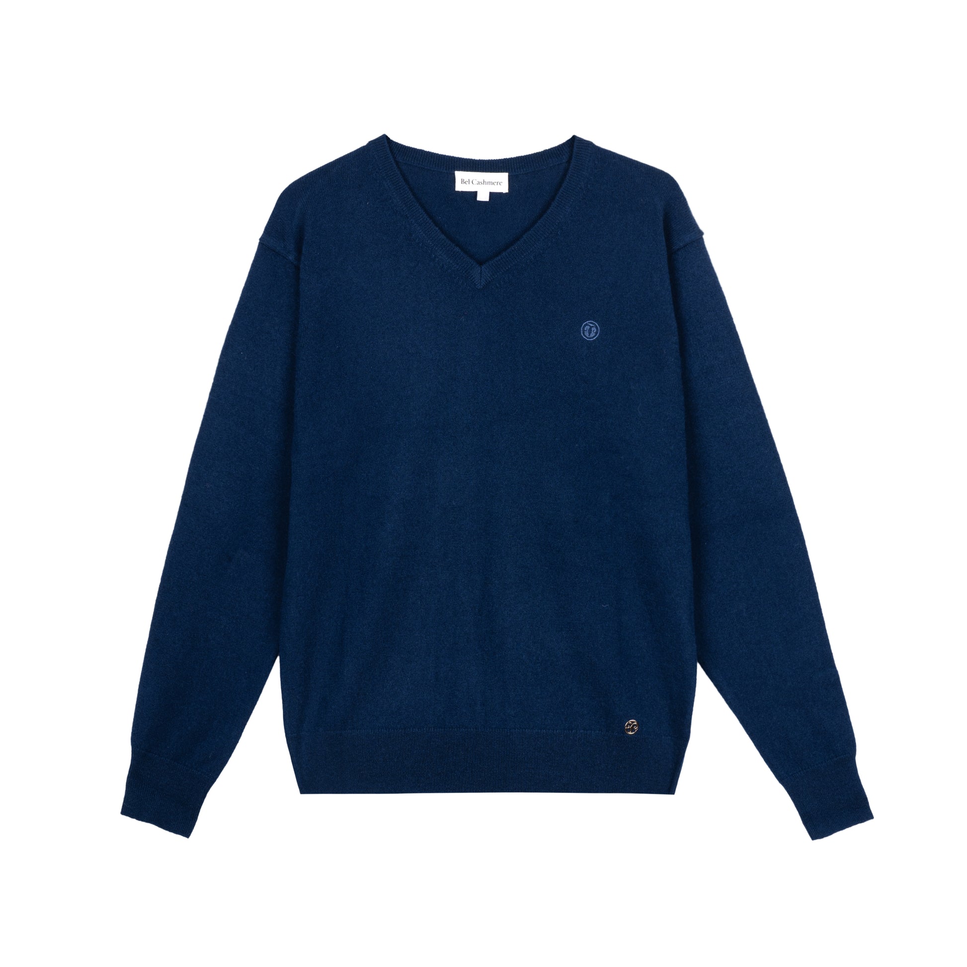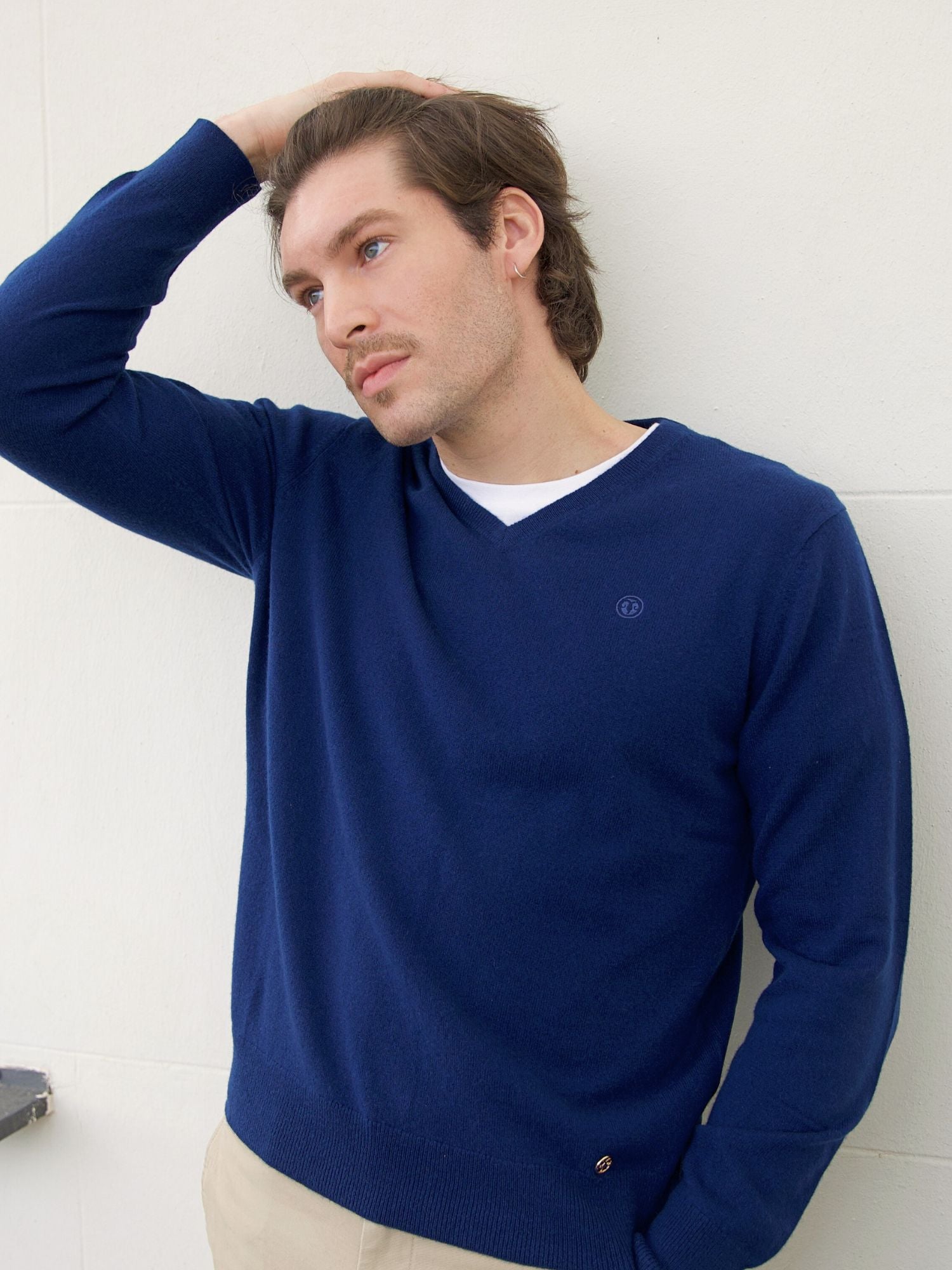 El jersey de hombre con cuello en pico, tejido en cashmere, ofrece un perfil clásico y atemporal. Una elección infalible para llevar sola o bajo americana.