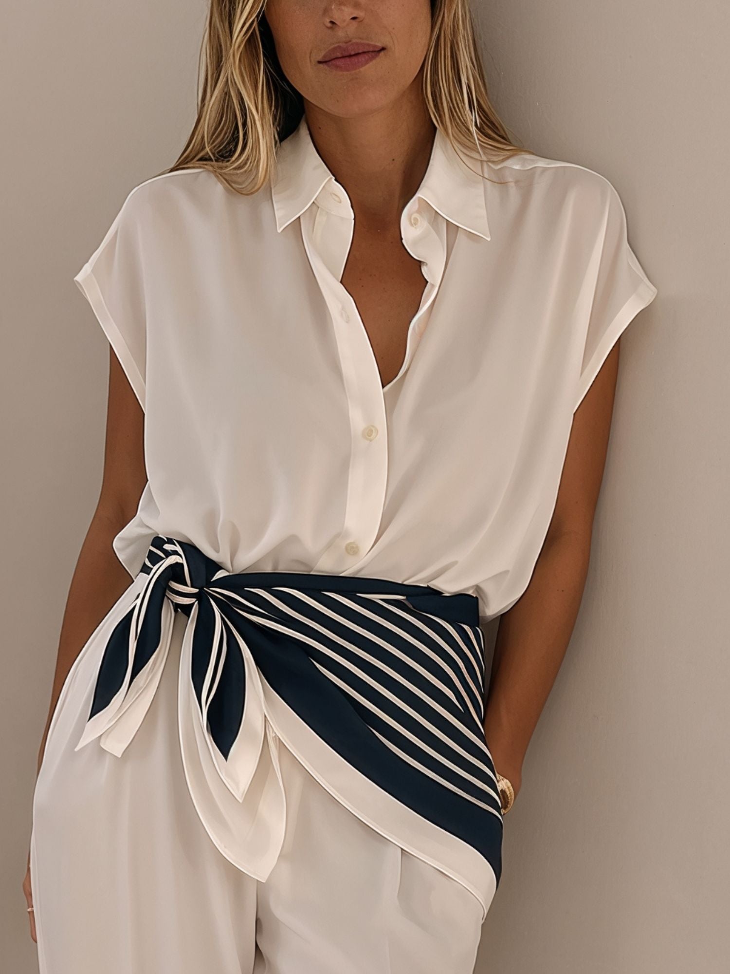 Este pañuelo está confeccionado con pura seda. Tiene un bonito y atemporal diseño de rayas y su tamaño amplio de 90 x 90 cm permite poder llevarlo de muchas formas.